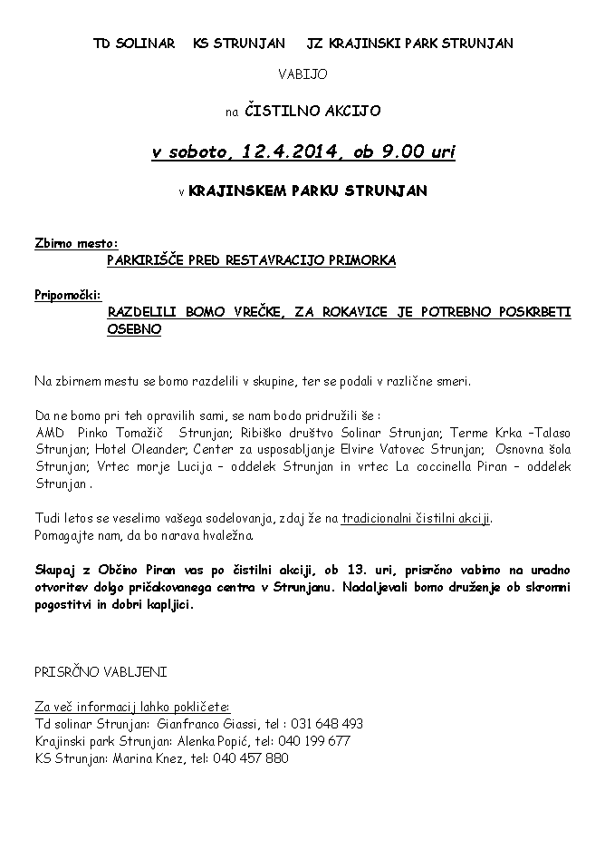 Kot že nekaj let zapored, tudi letos Krajinski park Strunjan skupaj s Turističnim društvom Solinar in Termami Krka organizira čistilno akcijo.