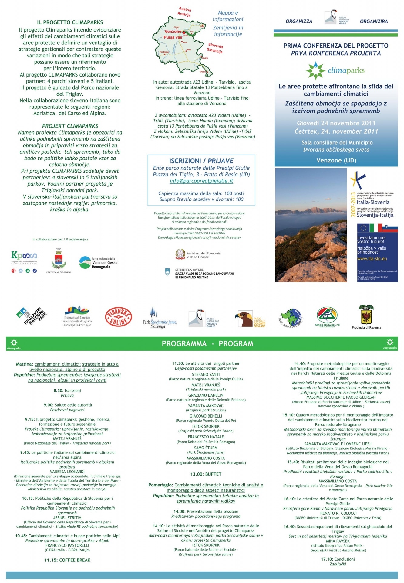 V prilogi vam posredujemo vabilo na prvo konferenco projekta Climaparks – Klimatske spremembe in upravljanje zavarovanih območij (www.climaparks.eu), sofinanciran v okviru Programa čezmejnega sodelovanja Slovenija-Italija 2007-2013. Predstavitveni dogodek bo potekal v četrtek, 24. novembra 2011, v Dvorani občinskega sveta, Pušja vas (Venzone).