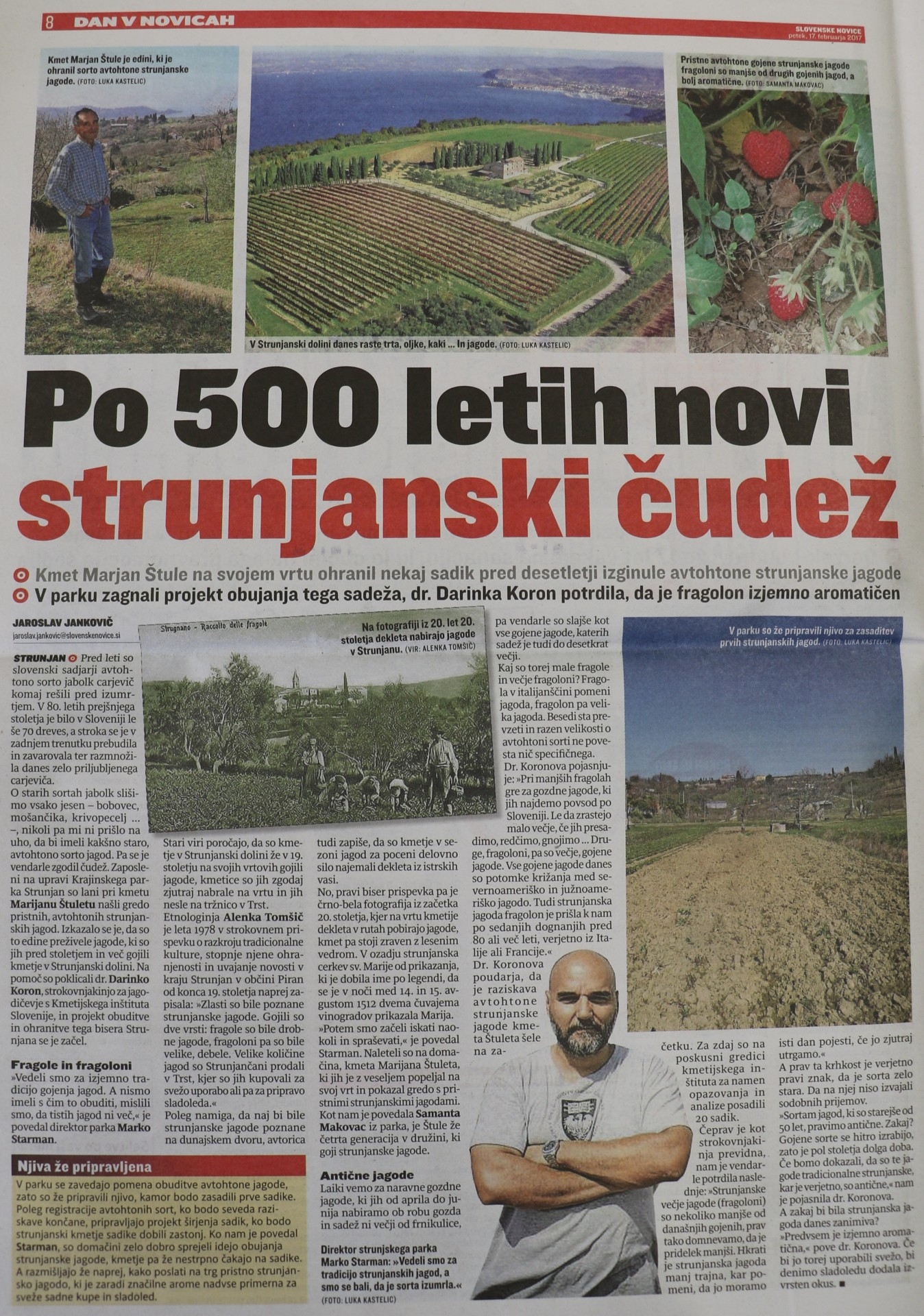 O starih sortah jabolk slišimo vsako jesen – bobovec, mošančika, krivopecelj …. – nikoli pa mi ni prišlo na uho, da bi imeli kakšno staro, avtohtono sorto jagod. Pa se je vendarle zgodil čudež. Zaposleni na upravi Krajinskega parka Strunjan so lani pri kmetu Marijanu Štuletu našli gredo pristnih, avtohtonih strunjanskih jagod. Izkazalo se je, da so to edine preživele jagode, ki so jih pred stoletjem in več gojili kmetje v Strunjanski dolini. Na pomoč so poklicali dr. Darinko Koron, strokovnjakinjo za jagodičevje s Kmetijskega inštituta Slovenije, in projekt obuditve in ohranitve tega bisera Strunjana se je začel.