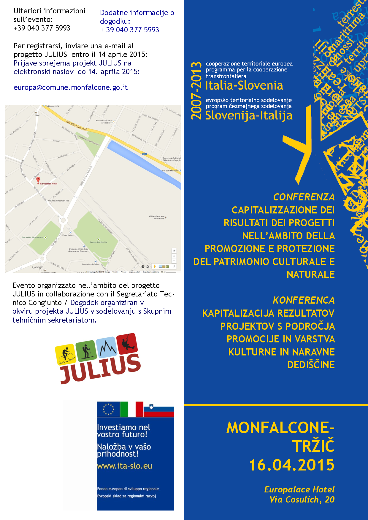 Dogodek organiziran v okviru projekta JULIUS v sodelovanju s Skupnim tehničnim sekretariatom, je bil namenjen kapitalizaciji rezultatov projektov, ki so bili sofinancirani v okviru Programa čezmejnega sodelovanja Slovenija – Italija 2007-2013, na področju promocije in varstva kulturne in naravne dediščine.