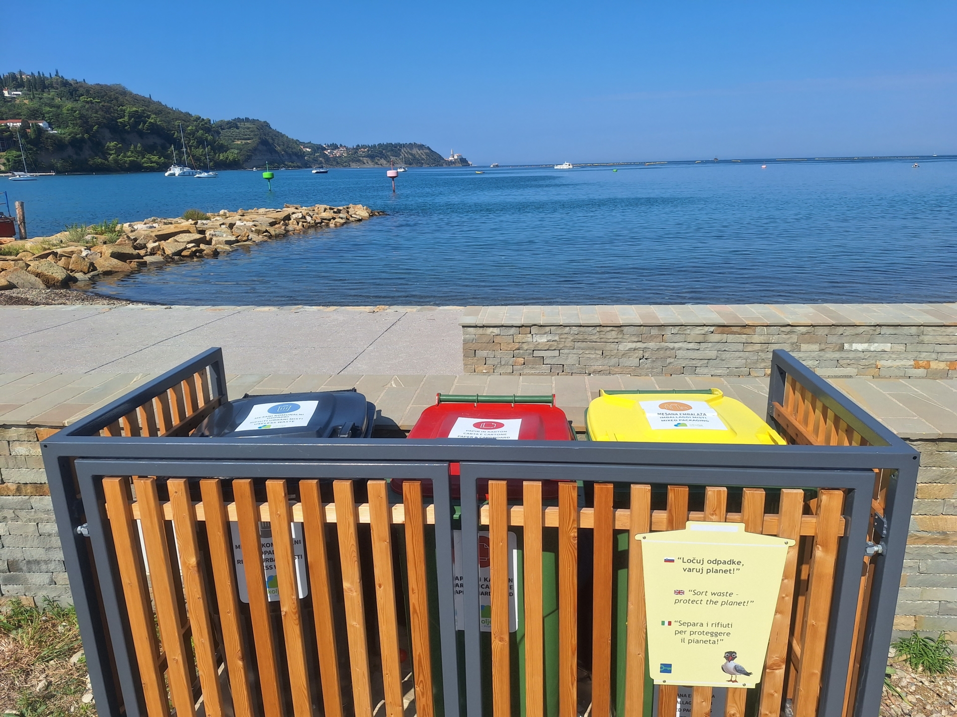 Eden izmed zastavljenih ciljev je tudi bolj odgovorno ločevanje odpadkov. Zaposleni smo od nekdaj ločevali odpadke na biološke, mešane in tiste iz papirja. Obenem skrbimo, da gredo tudi baterije v ločeno posodico, saj so le te nevaren odpadek. Sedaj pa naslavljamo k takemu ločevanju tudi obiskovalce parka. Zaradi omejenega prostora v upravi parka smo v ribiškem pristanišču namestili ekološki otok, kjer lahko vidimo tudi črnoglavega galeba Marina. Simpatična maskota nagovarja obiskovalce, da ločujejo odpadke. Slednje je pomembno zaradi ponovne uporabe oz. recikliranja odpadkov in zmanjševanja količin odpadov na odlagališčih. Obenem pa pravilno ravnanje z odpadki preprečuje onesnaženje in sproščanje škodljivih snovi v okolje. Marino je prisoten tudi v aplikaciji Nexto, popeljal vas bo na poučen in zabaven način po Krajinskem parku Strunjan.