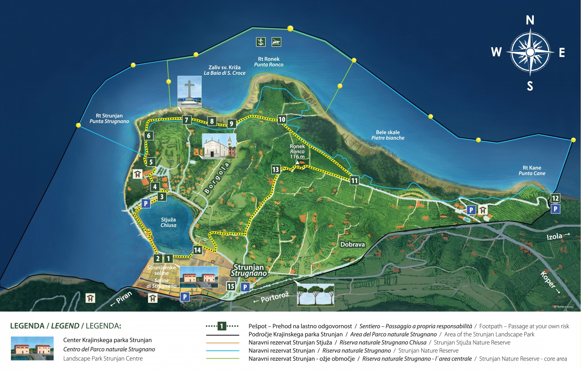 Tematska krožna pot – Strunjan v podobah morja, je opremljena s celovitim sistemom informativnih tabel in postajališč s klopmi. Gre za strnjeno in interaktivno obliko podajanja vsebin za popolno predstavitev parka. Poleg vstopnih točk v park, je urejena krožna pot, z vsemi usmeritvami na trasi, kjer informativne točke še bolj razlagajo specifične lastnosti na posamezni lokaciji, hkrati pa se obiskovalec lahko na njej dalj časa zadrži, prav zaradi dodane vrednosti počivališča. Posegi v prostor so bili nevpadljivi, predvsem zaradi uporabe lokalnih materialov.