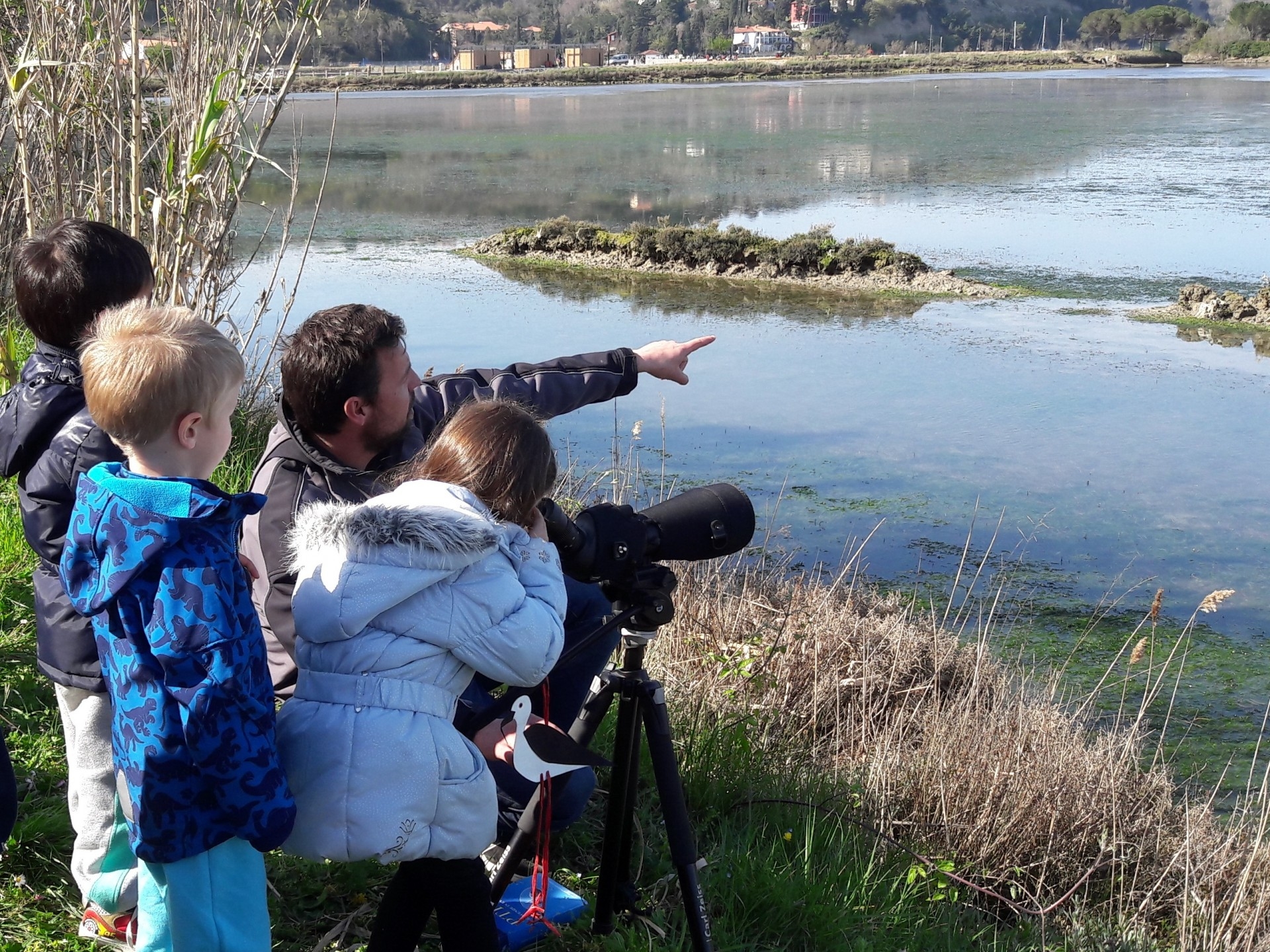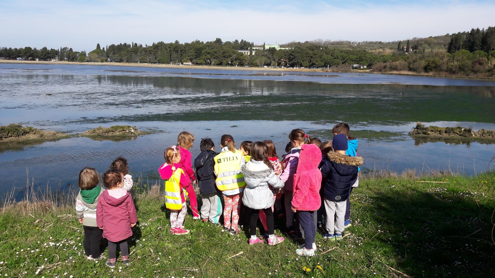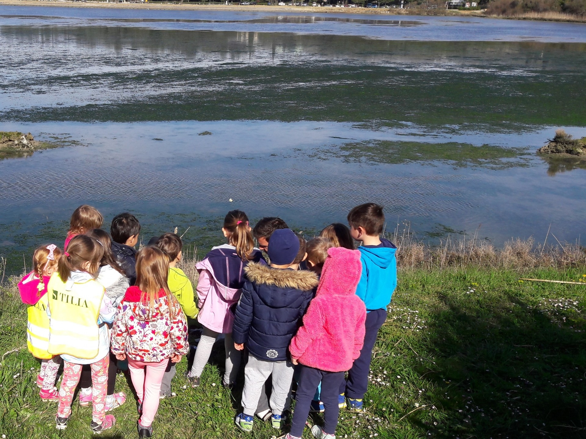 Prvič smo se odpravili do lagune Stjuža in jim razložili zakaj je pomembna. Vprašali smo jih ali laguna pozimi zamrzne ter ali so se že kdaj drsali po njej. Ugotovili smo, da slednje ni mogoče, ker je voda v njej slana in ne sladka in zato se še nihče ni drsal po njej. Nato smo ugotovili, da je bila laguna bila nekoč ribogojnica in da so v njej ulovili 1 tono rib. Za konec smo pogledali, če je okoli nas kakšna ptica in pozdravile so nas race mlakarice. Otroci so jih želeli nahraniti, pa smo jim povedali, da se tega ne sme početi, ker njihov jedilnik sestavljajo rastline, ki rastejo na dnu lagune oz. okoli nje. Na drugi strani lagune so bile male bele čaplje, ki smo jih pogledali z daljnogledom in skozi teleskop. Kasneje pa smo iz kolaža poskušali sestaviti markantne polojnike, ki gnezdijo na solinah.