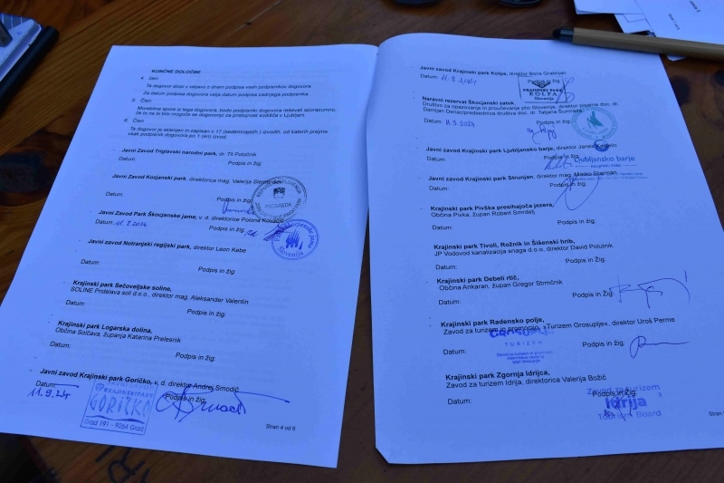 Sledilo je še slovesno dejanje: podpis dogovora št. 5 o pristopu novega člana v Skupnost zavarovanih območij narave Slovenije. Prisotni direktorji ali njihovi namestniki so podpisali in žigosali listino o pridružitvi sedemnajstega člana – Krajinskega parka Lahinja.