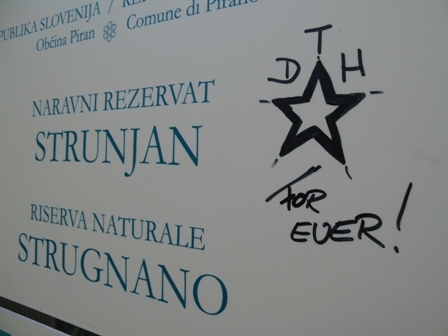 V rezervatu Krajinskega parka Strunjan smo v 1.7.2011 opazili, da je neznani storilec z alkoholnim pisalom počečkal štiri informativne table in na obali Zaliva sv. Križa narisal 3 velike grafite.